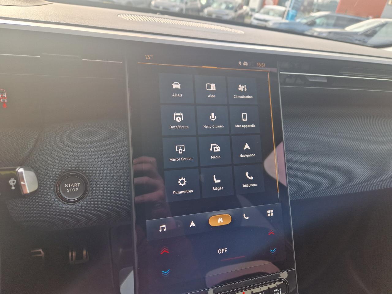 1 prise USB type-C rétroéclairées à l'avant (charge et data) + prise USB type-C rétroéclairées à l'avant (charge) + 2 prises USB type-C rétroéclairées à l'arrière de la console centrale (charge)3 prises 12 V (Console centrale, arrière de la console centrale, coffre)6 haut-parleursABS avec répartiteur électronique de freinage (REF) et aide au freinage d'urgence (AFU)Accès et démarrage mains libres ProximityAccoudoir central sur banquette ARAérateurs en rang 2Affichage tête haute étenduAide au démarrage en côteAide au stationnement avantAirbags frontaux, latéraux AV, rideauxAllumage adaptatif des feux de croisementAllumage des feux de détresse en cas de forte décélérationAmbiance Hype BlueApple Carplay et Android Auto sans filBanquette arrière avec dossiers inclinablesBanquette arrière fractionnable (40/20/40)BluetoothBoîtier télématique : Appel d’urgence et Citroën AssistanceBoitiers de rétroviseurs extérieurs noir brillantCalandre noir brillantCentre de roue noir avec logo et cache écrousClignotants impulsionnelsClimatisation automatique bi-zone étendueCoffee Break AlertColor Clips Gold SatinCompteurs numériques avec écran couleur personnalisable 10"Condamnation centralisée avec plipContrôle dynamique de stabilité (ESP)Détection de sous-gonflage des pneumatiquesDirection à assistance électriqueEclairage d'ambiance étendu, 8 couleursEclairage intérieur à LEDEcran central verticale 13"" tactileEssuie-vitres automatiques avec fonction Magic WashFeux arrière 3D à LED Citroën Light WingsFeux clignotants intégrés aux feux de jour à LEDFrein de stationnement électriqueHayon mains libresJantes alliage 19'' ZirconeNavigation 3D ConnectéePack DesignPack Drive Assist 2.0Pare-brise feuilleté et acoustiquePédalier et repose-pied en aluminiumPeinture métallisée Rouge RubisPlancher de coffre modulable 2 positionsPoignées de maintien couleur chromePoignées de portes extérieures couleur caissePrédisposition attelageProjecteurs Matrix LEDRadio DAB+Recharge sans fil pour smartphoneReconnaissance étendue des panneaux et recommandation de vitesseRétroviseur intérieur électrochromeRétroviseurs extérieurs à mémoire indexés à la marche arrièreRétroviseurs extérieurs électriques et dégivrantsRétroviseurs extérieurs rabattables électriquement avec éclairage d'accueil à LEDSécurité enfants manuelleSélecteur de mode de conduiteServices Connect PlusSiège passager à réglage manuel 6 voiesSièges Advanced ComfortSuspension Citroën Advanced ComfortTémoin et alerte sonore de non-bouclage des ceintures de sécurité avant et arrièreToit bi-ton Noir Perla NeraVisioPark 360°Vitres arrière, vitres de custode et lunette arrière surteintéesVolant gainé multifonctions avec décor Noir BrillantZone d’intégration des Color Clips Noir Brillant