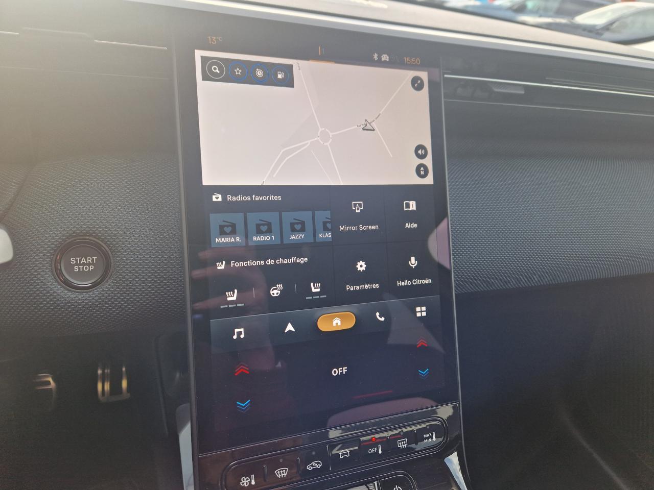 1 prise USB type-C rétroéclairées à l'avant (charge et data) + prise USB type-C rétroéclairées à l'avant (charge) + 2 prises USB type-C rétroéclairées à l'arrière de la console centrale (charge)3 prises 12 V (Console centrale, arrière de la console centrale, coffre)6 haut-parleursABS avec répartiteur électronique de freinage (REF) et aide au freinage d'urgence (AFU)Accès et démarrage mains libres ProximityAccoudoir central sur banquette ARAérateurs en rang 2Affichage tête haute étenduAide au démarrage en côteAide au stationnement avantAirbags frontaux, latéraux AV, rideauxAllumage adaptatif des feux de croisementAllumage des feux de détresse en cas de forte décélérationAmbiance Hype BlueApple Carplay et Android Auto sans filBanquette arrière avec dossiers inclinablesBanquette arrière fractionnable (40/20/40)BluetoothBoîtier télématique : Appel d’urgence et Citroën AssistanceBoitiers de rétroviseurs extérieurs noir brillantCalandre noir brillantCentre de roue noir avec logo et cache écrousClignotants impulsionnelsClimatisation automatique bi-zone étendueCoffee Break AlertColor Clips Gold SatinCompteurs numériques avec écran couleur personnalisable 10"Condamnation centralisée avec plipContrôle dynamique de stabilité (ESP)Détection de sous-gonflage des pneumatiquesDirection à assistance électriqueEclairage d'ambiance étendu, 8 couleursEclairage intérieur à LEDEcran central verticale 13"" tactileEssuie-vitres automatiques avec fonction Magic WashFeux arrière 3D à LED Citroën Light WingsFeux clignotants intégrés aux feux de jour à LEDFrein de stationnement électriqueHayon mains libresJantes alliage 19'' ZirconeNavigation 3D ConnectéePack DesignPack Drive Assist 2.0Pare-brise feuilleté et acoustiquePédalier et repose-pied en aluminiumPeinture métallisée Rouge RubisPlancher de coffre modulable 2 positionsPoignées de maintien couleur chromePoignées de portes extérieures couleur caissePrédisposition attelageProjecteurs Matrix LEDRadio DAB+Recharge sans fil pour smartphoneReconnaissance étendue des panneaux et recommandation de vitesseRétroviseur intérieur électrochromeRétroviseurs extérieurs à mémoire indexés à la marche arrièreRétroviseurs extérieurs électriques et dégivrantsRétroviseurs extérieurs rabattables électriquement avec éclairage d'accueil à LEDSécurité enfants manuelleSélecteur de mode de conduiteServices Connect PlusSiège passager à réglage manuel 6 voiesSièges Advanced ComfortSuspension Citroën Advanced ComfortTémoin et alerte sonore de non-bouclage des ceintures de sécurité avant et arrièreToit bi-ton Noir Perla NeraVisioPark 360°Vitres arrière, vitres de custode et lunette arrière surteintéesVolant gainé multifonctions avec décor Noir BrillantZone d’intégration des Color Clips Noir Brillant