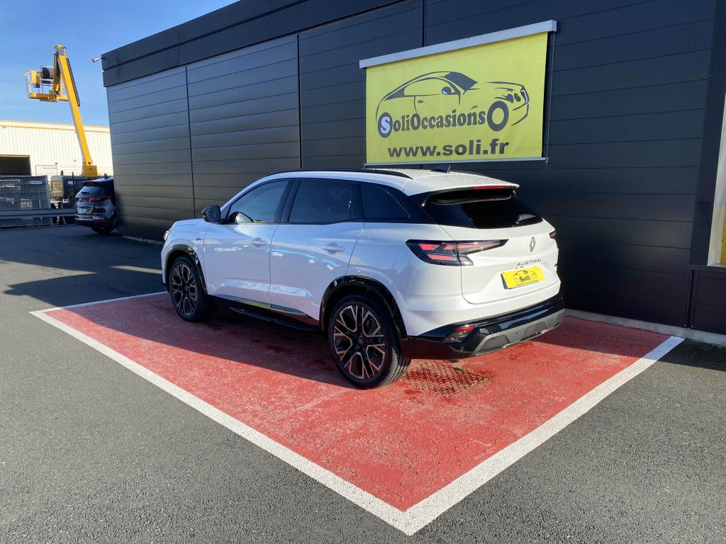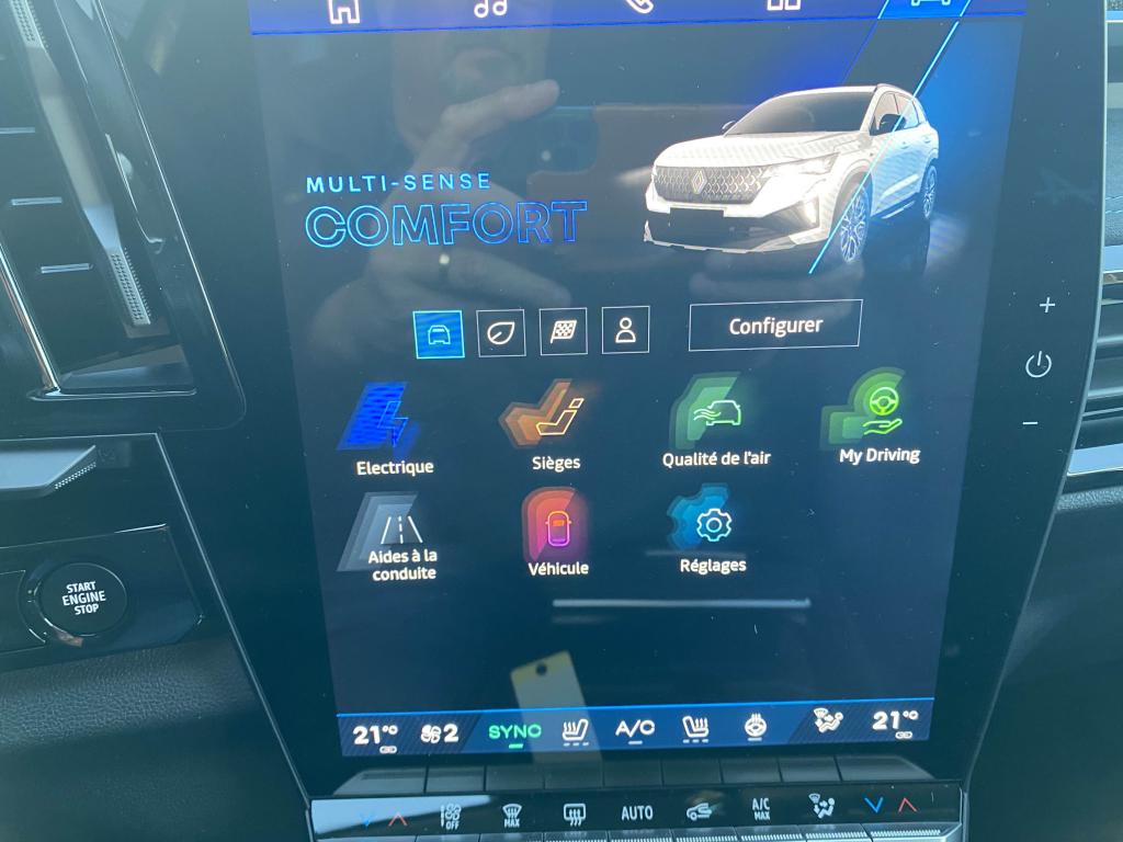 Accoudoir central ARActive driver assist : régulateur de vitesse adaptatif intelligent + centrage dans la voie avec scène réalisteAide au démarrage en côteAide au maintien dans la voieAide au parking avant, arrière et latéralAlerte de distance de sécuritéAlerte sortie sécurisée des occupantsAndroid Auto et Apple CarPlayAntenne requin Noir étoiléAppel d'urgenceAvertisseur d'angle mortAvertisseur de changement de voieAvertisseur de sortie de stationnement en marche arrièreBanquette arrière coulissanteBarres de toit Noir SatinCalandre identitaire noir brillantCaméra de recul analogiqueCarte accès et démarrage mains-libresChargeur smartphone à inductionClimatisation automatique bi-zoneCommutation automatique des feux route/croisementConduite hybride prédictiveDétection arrière avec correction trajectoire d’urgenceDétection avant avec correction trajectoire d’urgenceEcran conducteur de 12.3''Essuie-vitres automatiquesFeux LED adaptive vision (avec fonction antibrouillard intégrée)Finition planche de bord et panneaux de porte en AlcantaraFOTA (Firmware Over-The-Air)Frein de parking électrique avec fonction Auto-HoldFreinage automatique d'urgence en marche arrière (RAEB)Freinage d'urgence autonome avec fonction intersectionFreinage d’urgence automatique urbain/péri-urbain avec détection piétons et cyclistesHayon électrique mains-libresJantes alliage 20” altitude diamanté noir avec vernis fumé grisLimiteur de vitesseLogos avant et arrière noir brillantMonogramme noir brillantMultisense 4 modes (perso/sport/comfort/eco)OpenR link 12” : système multimédia connecté avec Google intégré incluant pack navigation (Google Maps et Google Assistant) pendant 5 ans, et pack infotainment (Google Play)Pack remote services (via l'application My Renault) inclus pendant 5 ansPédalier en aluminiumPeinture Rouge FlammeReconnaissance des panneaux de signalisation avec alerte de survitesseRéplication smartphone sans filRétroviseur intérieur électrochrome sans contourRétroviseurs extérieurs rabattables électriquementSellerie mixte tissu carbone Alcantara avec surpiqûres bleu, blanc, rougeSiège conducteur électrique avec fonction massage réglage lombaireSiège passager électriqueSiège passager réglable en hauteurSièges avant chauffantsSystème audio Arkamys auditorium avec 6 haut-parleursSystème d'alerte franchissement de ligne (LDW)Système de reconnaissance faciale du conducteurSystème de surveillance de l'attention du conducteurVitres arrière surteintéesVolant chauffantVolant spécifique en textile refined avec insert Alcantara